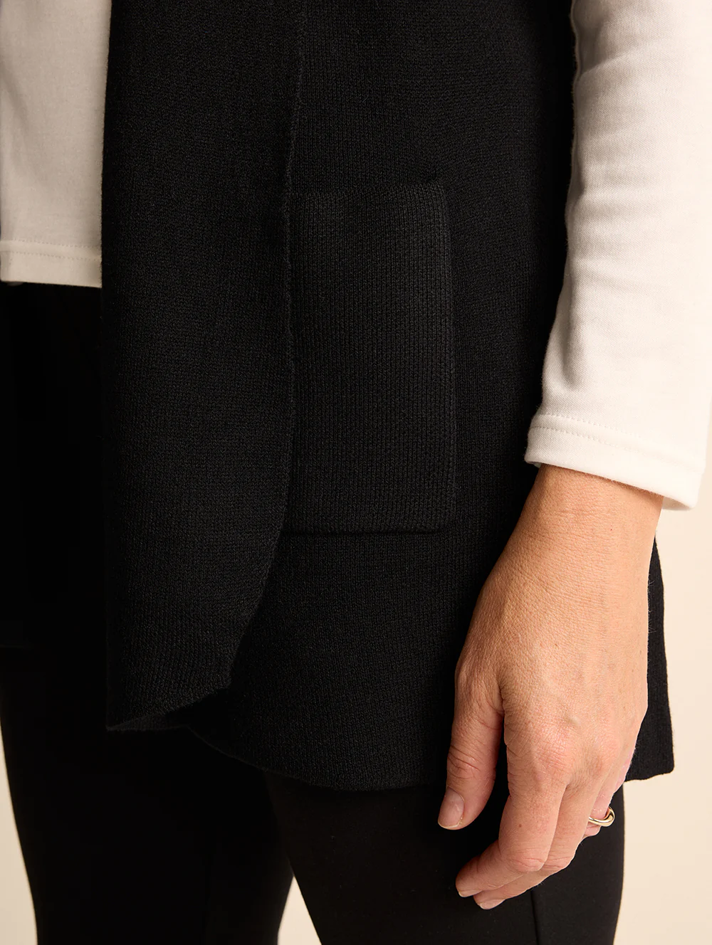 Discover the Essie Knit, a harmonious blend of style and comfort. Crafted with 44% Polyester, 30% Acrylic, 20% Nylon, and 6% Wool, this longline knit vest boasts a curved hem, fold-over neck, and practical front pockets. Its adaptable design makes it the perfect layering piece for any occasion. Embrace both warmth and fashion with Essie, your go-to choice for versatile and chic ensembles. Available in Black.