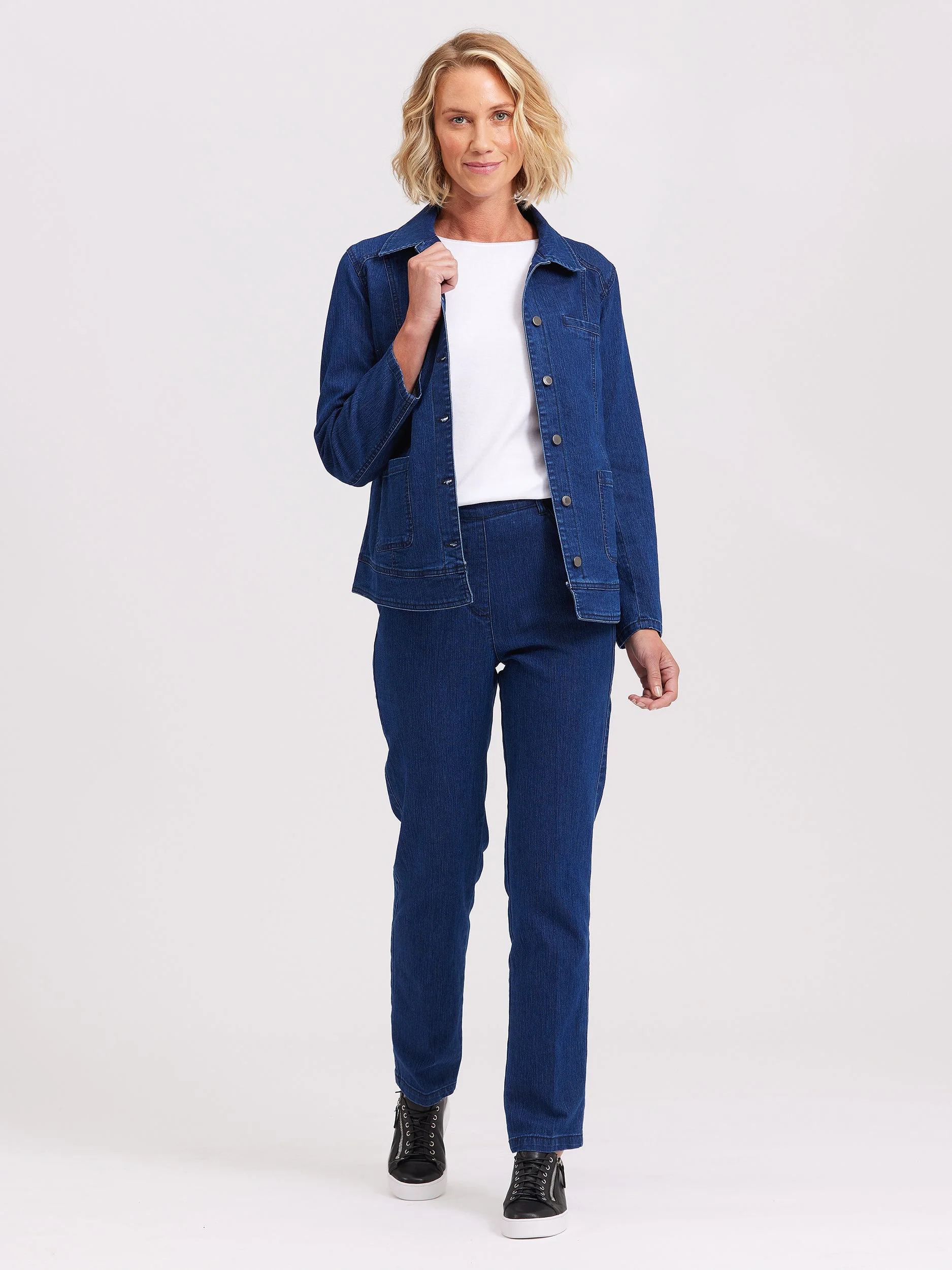 The Heritage Denim Jacket is a trans seasonal must-have. This jacket is made from our popular heritage denim, which features a vertical grain and extra stretch for comfort. The full length sleeves and front button closure shields you from chilly breezes, all while looking fabulous of course! Wear over your favourite outfit for added warmth and style. Available in Denim Blue