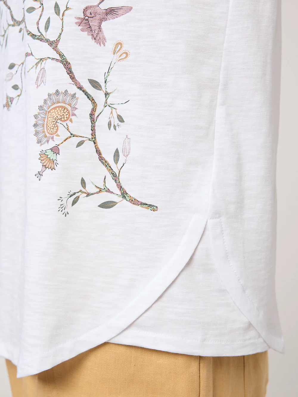 The Wattle Tree Top is a must-have for any casual summer wardrobe. Made from 100% cotton, this top features a round neck, short sleeves, and a curved front hem for a flattering fit. Its white color is the perfect canvas for the beautiful floral and bird placement print in brown, yellow, and pink. With a side hem cross over detail and a regular fit, this top is both stylish and comfortable. Available in Brown colour.